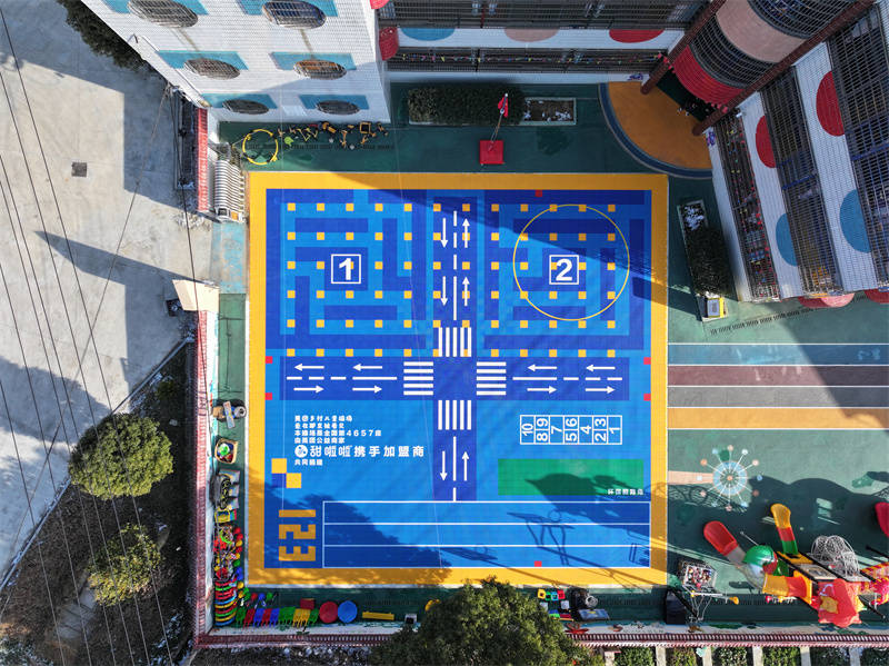 瞧,这个操场上,设计了8个基础的功能区,包含迷宫区、交通安全教育区、彩虹伞区、站点区、环保教育角、跑道区、跳房子区、足球篮球区。
